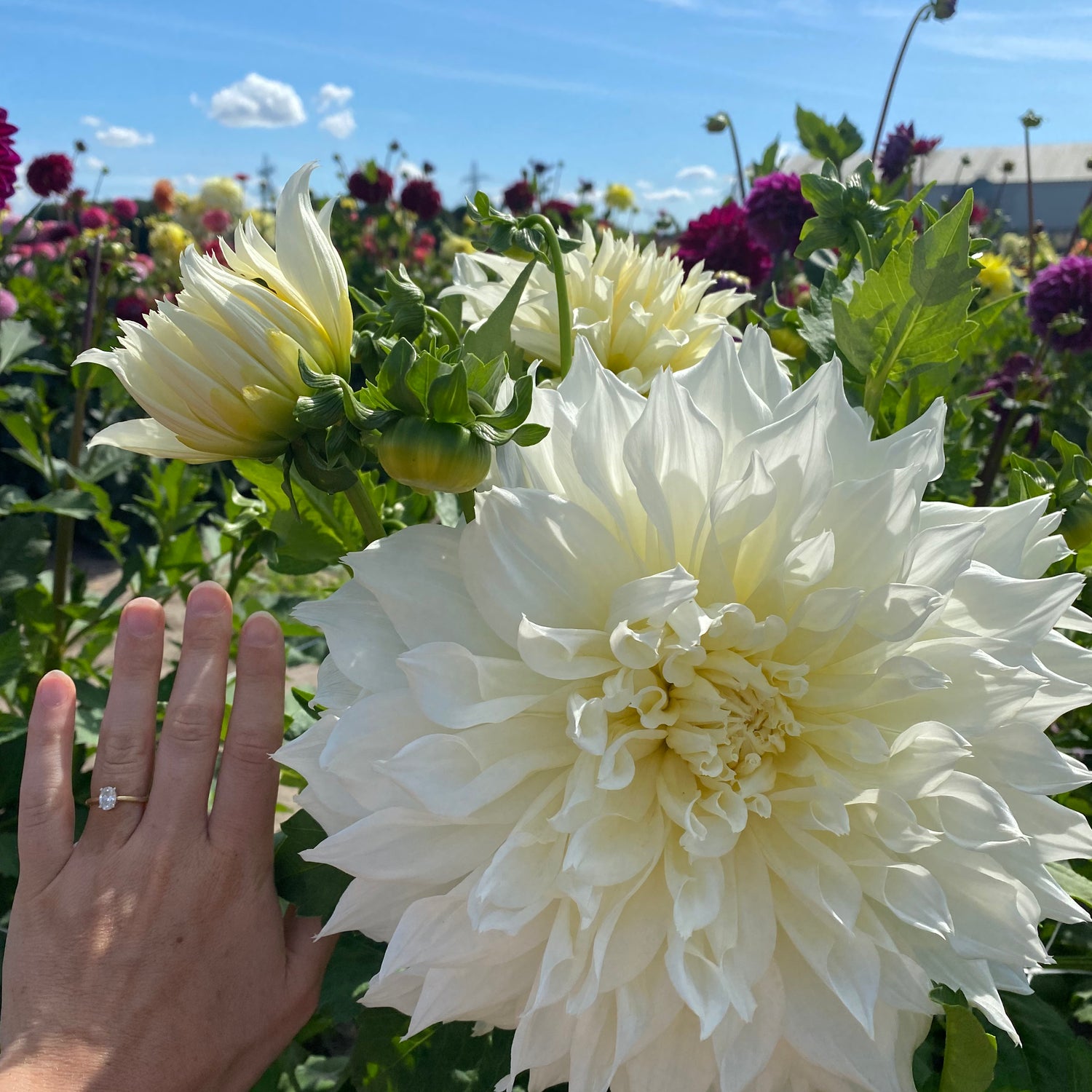 A show‑stopping dinner‑plate dahlia with enormous 23–28 cm creamy‑white blooms that glow with a soft buttery‑ivory center for a touch of warmth. Growing 90cm tall in full sun, ‘Fleurel’ is an informal decorative dahlia with a bold garden presence. It blooms from midsummer through first frost and makes a stunning choice for wedding bouquets, centerpiece arrangements, or dramatic border impact. Sold as a tuber clump.