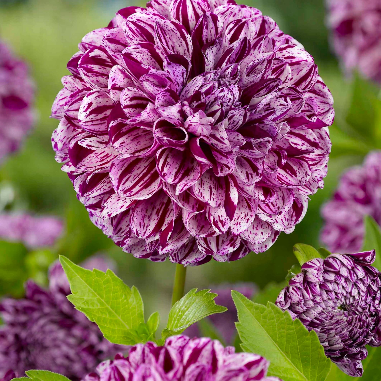 A mesmerizing pompon (ball) dahlia with perfectly round 12–14 cm blooms in a soft, marbled swirl of purple and vanilla-white. Resembling knitted spheres, these fully double flowers burst in abundance from mid-summer until the first frost. Dahlia 'Marble Ball' is an easy‑grow variety that offers long stems ideal for cut‑flower bouquets, mixed borders, or cottage gardens. Sold as a tuber clump.