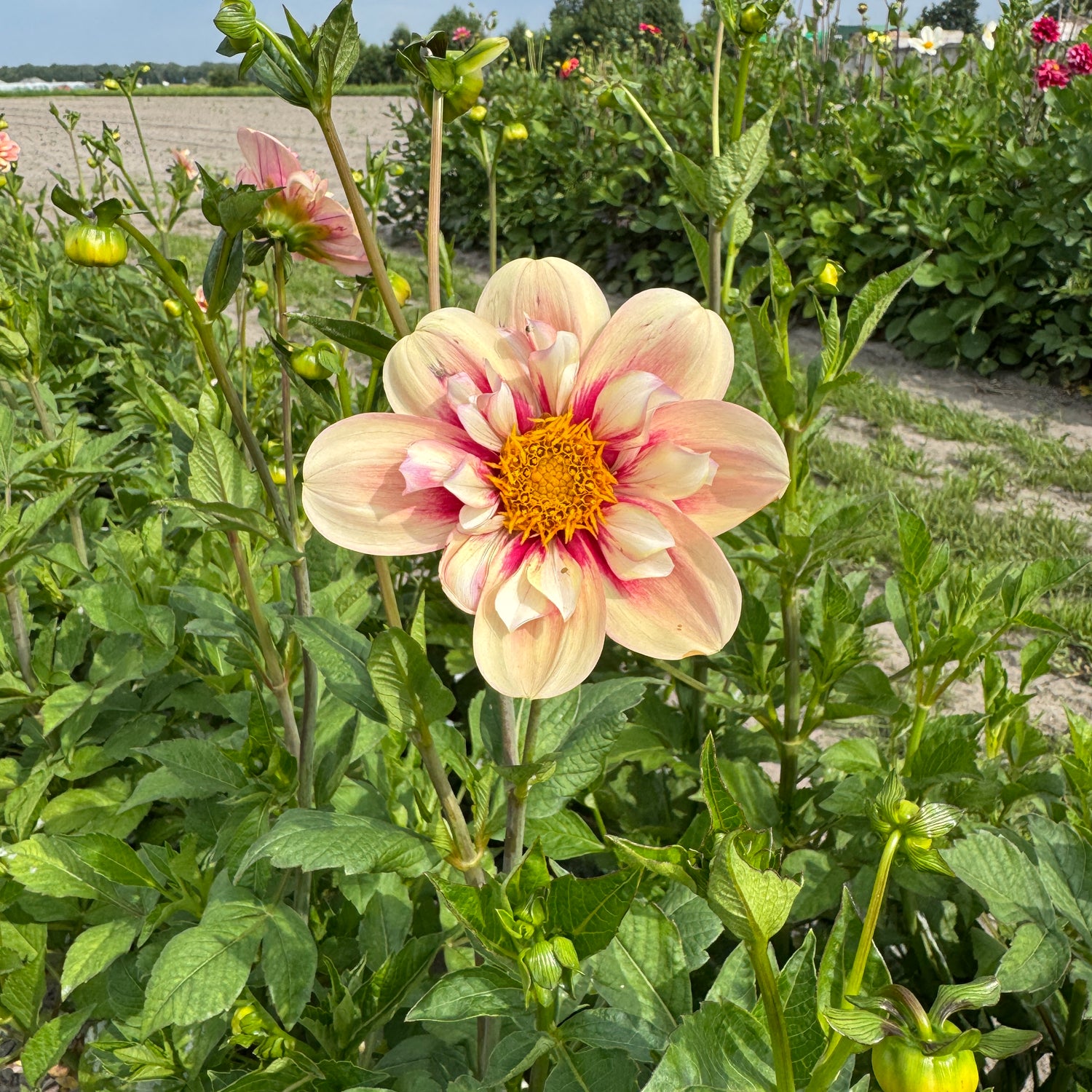 This charming collarette dahlia features creamy ivory and soft peach petals with vibrant rhubarb‑pink streaks, creating a stunning painted effect in your garden. Dahlia 'Rhubarb Custard' has long stems ideal for cut‑flower arrangements and borders or containers. Perfect for adding long‑lasting pastel drama and unique colour contrast to your outdoor space. Sold as a tuber clump.